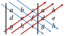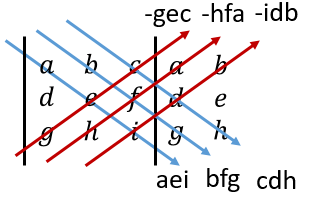 Vamos a extender las primeras dos columnas, a lado derecho. Tal como se explico en la definición de cálculo de determinantes de 3×3. Una vez logrando esta parte, tendremos lo siguiente: